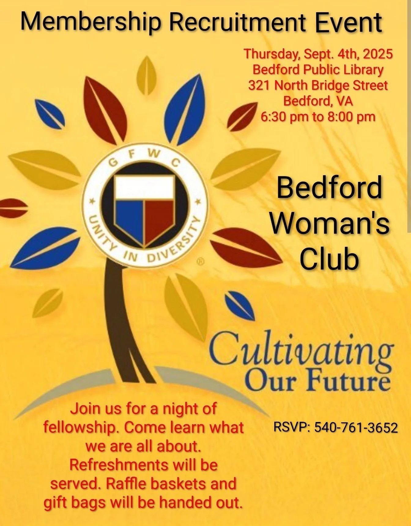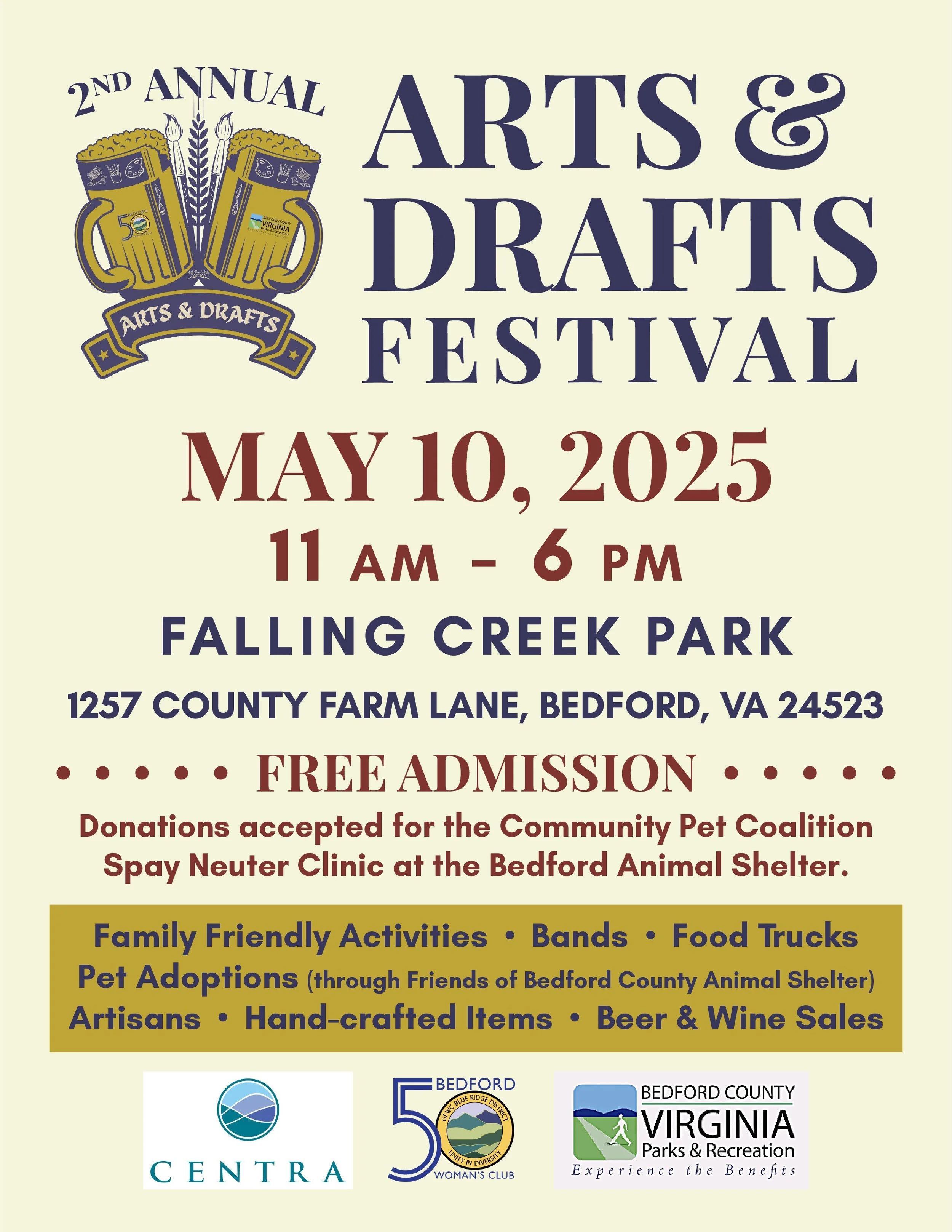 Join us for the Second Annual Arts and Drafts Festival at Falling Creek Park at 1257 County Farm Rd in Bedford VA on May 10, 2025 from 11 am until 6 pm. Are you interested in being a vendor at our event? Are you an artisan of hand-crafted items? Please contact us at gfwcbwc@gmail.com with photos of the products you create. Let’s talk and plan to bring you onboard for the day. Vendor booth fee is $30, Food Vendor fee if $75, Non-profit fee is $20.